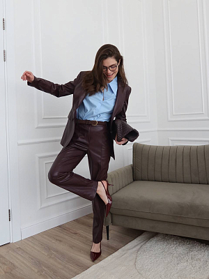 Несмотря на дерзкий материал, образ получается удивительно универсальным. Такой костюм отлично смотрится как на городской прогулке, так и на вечернем мероприятии. Добавьте минималистичные аксессуары — и вы готовы к встрече, на которой важно оставить впечатление. Обувь на умеренном каблуке или лоферы дополнят look, не перегружая его.